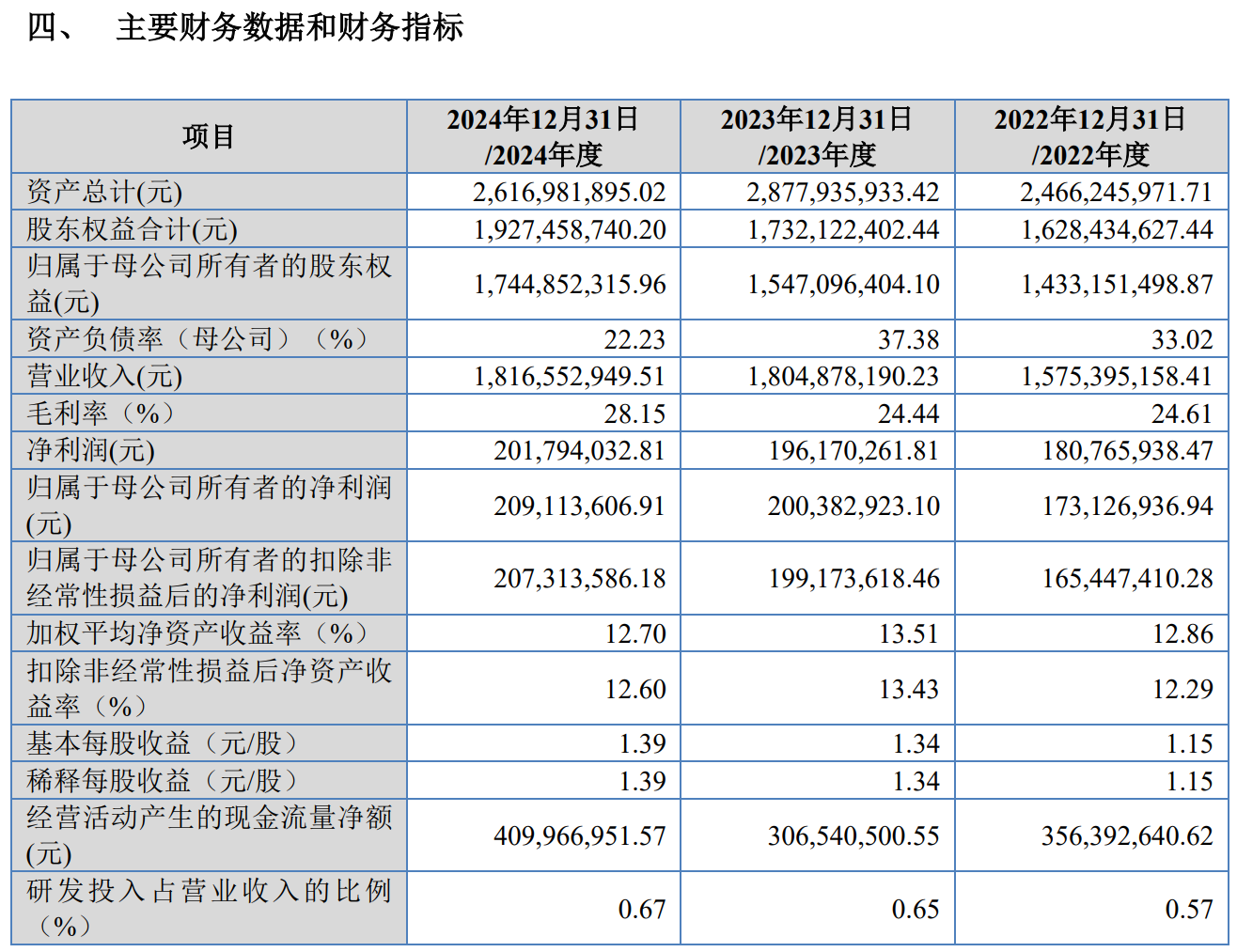 受行业影响,南方乳业去年业绩增速显著放缓。2022年至2024年(以下简称“报告期”),公司分别实现营业收入15.75亿元、18.05亿元、18.17亿元,归母净利润分别为1.73亿元、2.00亿元、2.09亿元。报告期内,公司乳制品业务占比均保持在95%以上。